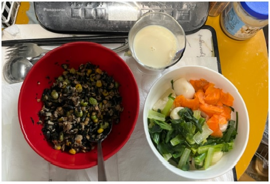 これらをすべて混ぜ、水50ccと本みりん・レモン汁・お酢・黒酢・ごま油・蜂蜜を・粉末黒糖それぞれ小さじ1/2杯ずつ加え、電子レンジ500Wで約5~6分加熱して主食とします。(乾燥わかめ・ひじき、レンズ豆は、前日水50ccで戻したものを使う)